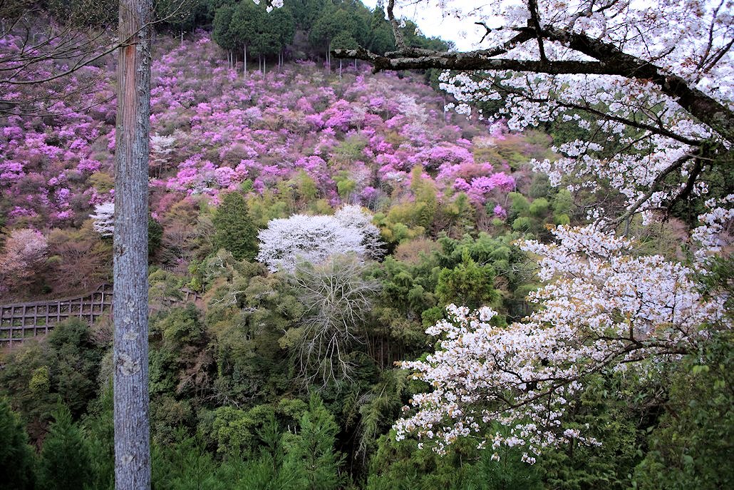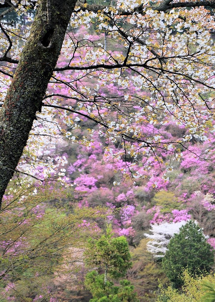 西明寺の住職が裏山に植えたとされるつつじ(右側の屋根は西明寺)。