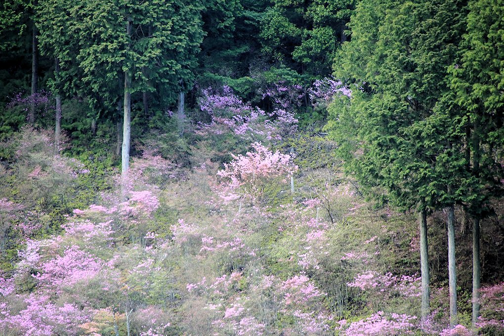 北山杉の奥まで這うように分け入っているミツバツツジ。